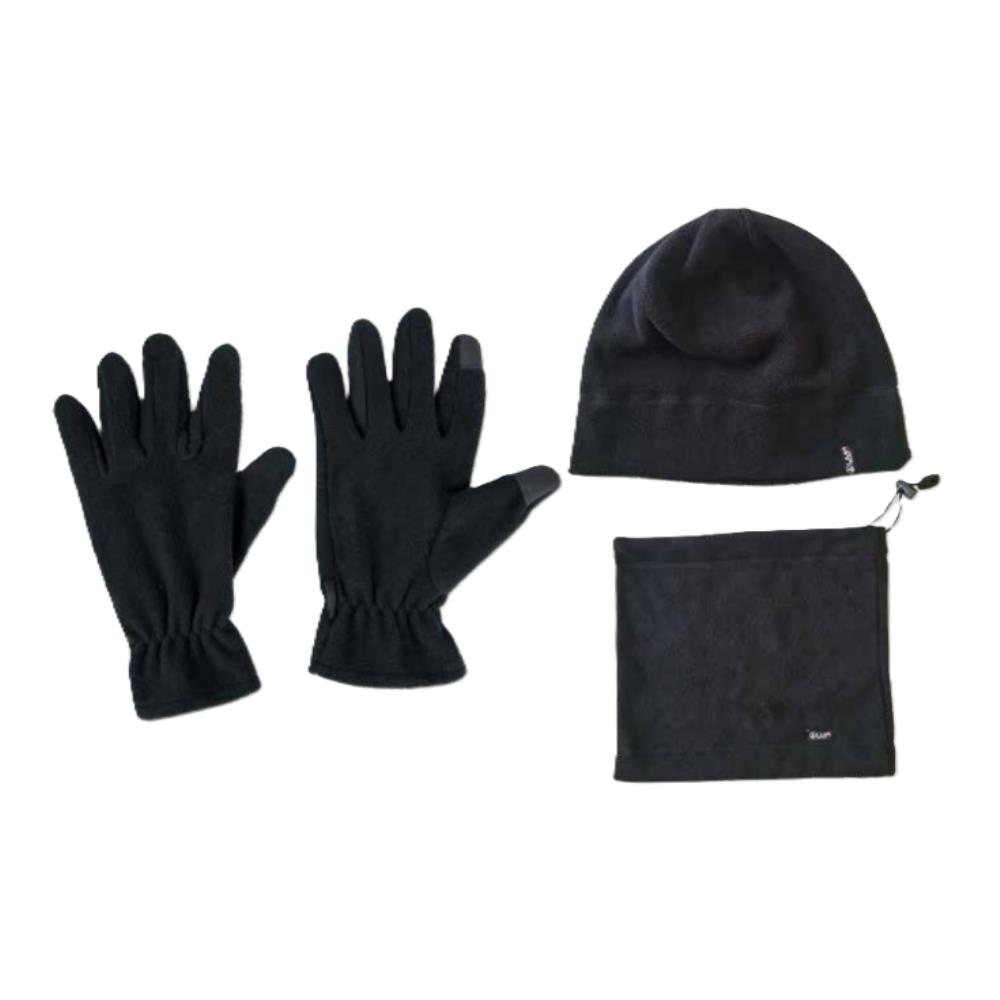 - Lot comprenant 1bonnet + 1 cache-cou (resserrable par élastique et stoppeur) + 1 paire de gants en polaire (pouces et index avec embouts spécial écran).