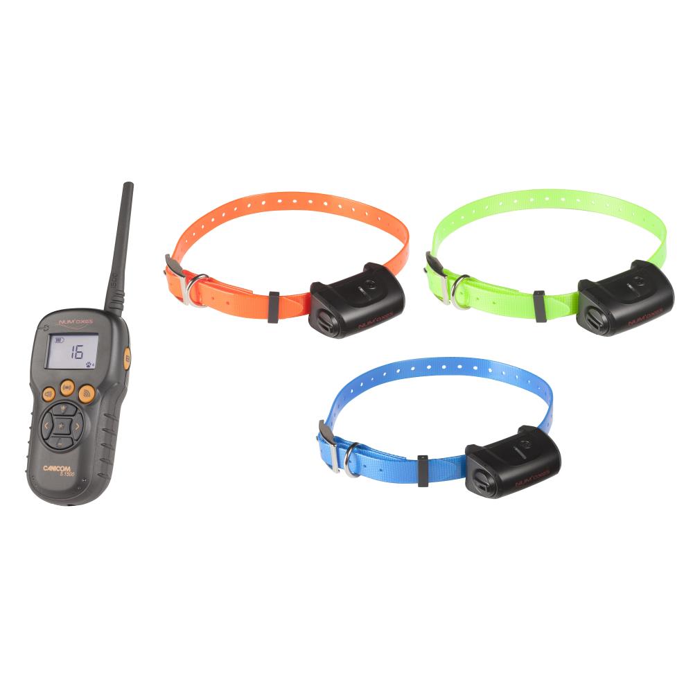 3 colliers de dressage Canicom 5 équipé d'électrodes courtes, 1 sangle polyuréthane orange, 1 sangle polyuréthane verte fluo, 2 piles lithium 3 Volts CR2 pour les colliers, 1 télécommande Canicom 5.1500 équipée de deux piles alcalines AA LR06, 1 accessoire multifonctions (outil pour dévisser le bouchon de pile du collier + clé magnétique + testeur), 2 jeux de 2 électrodes longues, 1 dragonne, 1 guide d'utilisation, 1 mallette de transport rigide.