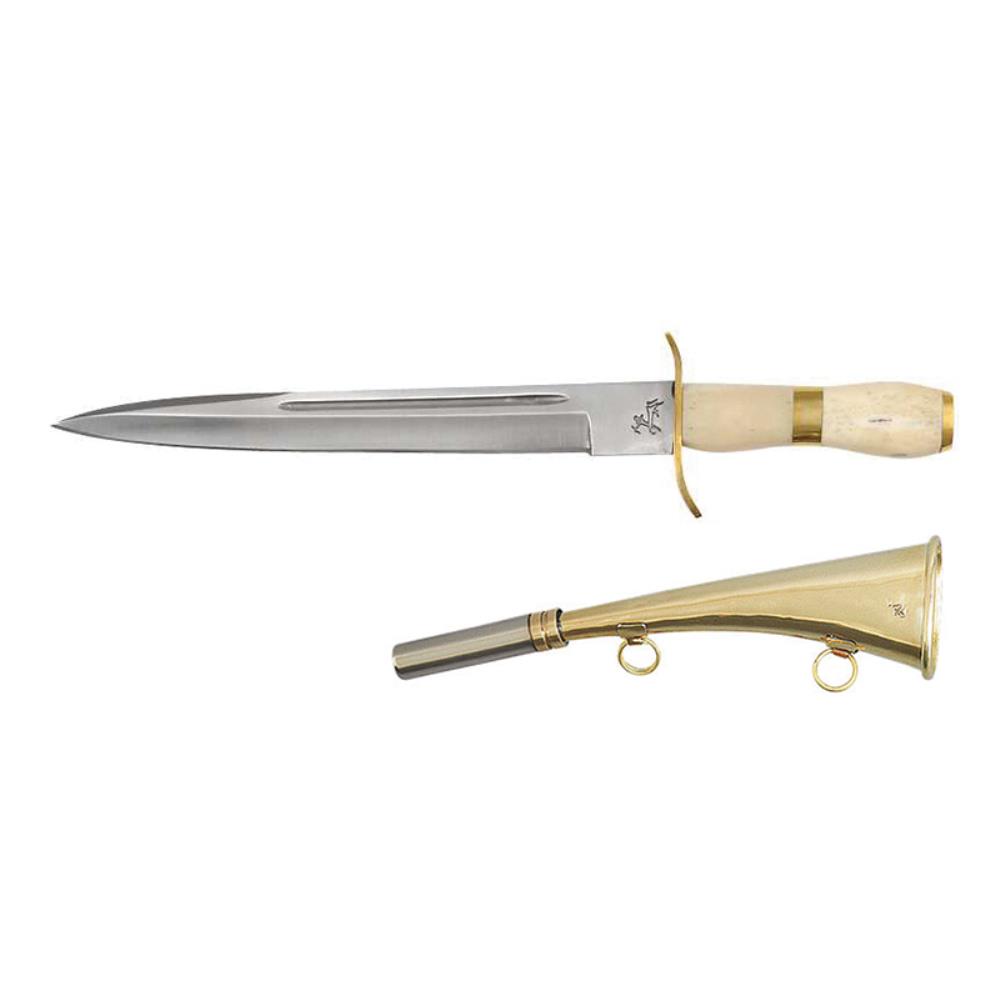La dague Kahn se distingue par sa lame de 26 cm en acier inoxydable 420, son manche en os poli et son étui en cuir de buffle. La trompe pibole de 22 cm en laiton complète l’ensemble avec une présentation traditionnelle, pour un pack simple, fonctionnel et facile à emporter.