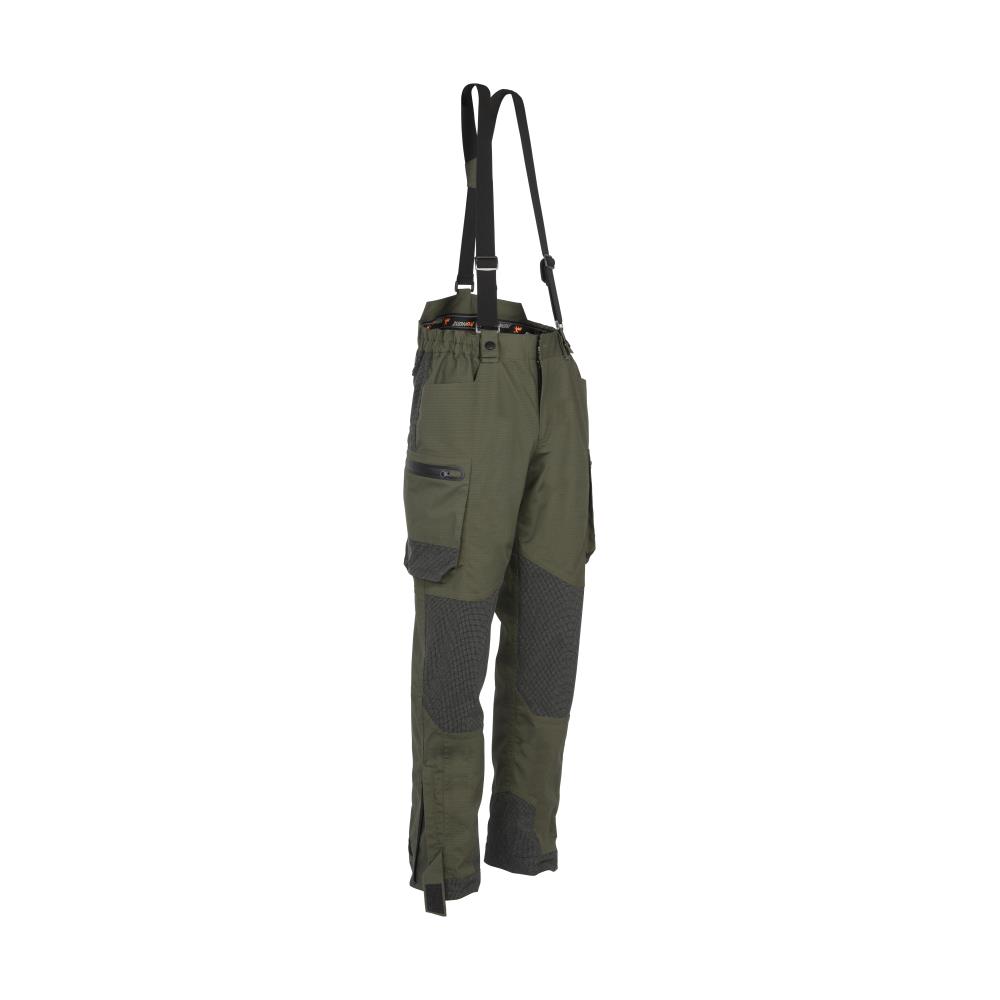 Composition : 2 tissus : (1) 100% polyester ripstop extensible, (2) 92% polyester, 8% spandex ripstop. Tissus laminés avec une membrane microporeuse imperméable et respirante, coutures étanches. Renforts aux genoux et bas de jambe en tissu haute résistance. Ceinture demi-élastiquée antiglisse montante dans le dos. 2 poches italiennes, 2 grandes poches cargo, 1 poche couteau et une poche arrière. Genoux préformés pour une meilleure ergonomie. Bas zippés et ajustables. Bretelles élastiques ajustables et amovibles. Coloris : kaki. Tailles : 38 à 56.
