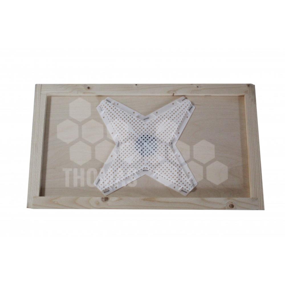 Ce plateau chasse-abeilles de Thomas Apiculture en forme d'étoile à 4 branches permet de dépeupler, en douceur, les hausses de miel avant la récolte. Se pose 24 à 48h avant la récolte des hausses entre le corps de ruche et la hausse ou entre une hausse vide posée au-dessus du corps et la/les hausse(s) pleine(s).La récolte des hausses se fait en douceur, avec moins d'agressivité de la part des butineuses.