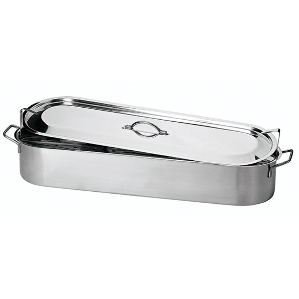 Cette poissonnière en inox de Baumalu vous permettra de cuire au court-bouillon les poissons longs ou de grande taille tels que le bar ou la truite par exemple. Sa grille est munie de 2 poignées ce qui vous permettra de retirer le poisson sans l'abîmer. Elle est compatible avec tout type de feu, y compris les feux à induction.