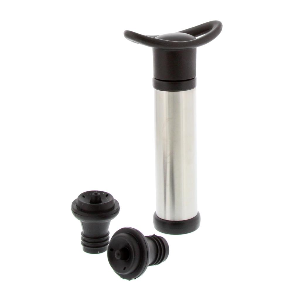 Coffret comprenant une pompe à vide d’air permettant de conserver plus longtemps des bouteilles de vin entamées. Placez le bouchon dans le goulot et aspirez l’air à l’aide de la pompe.