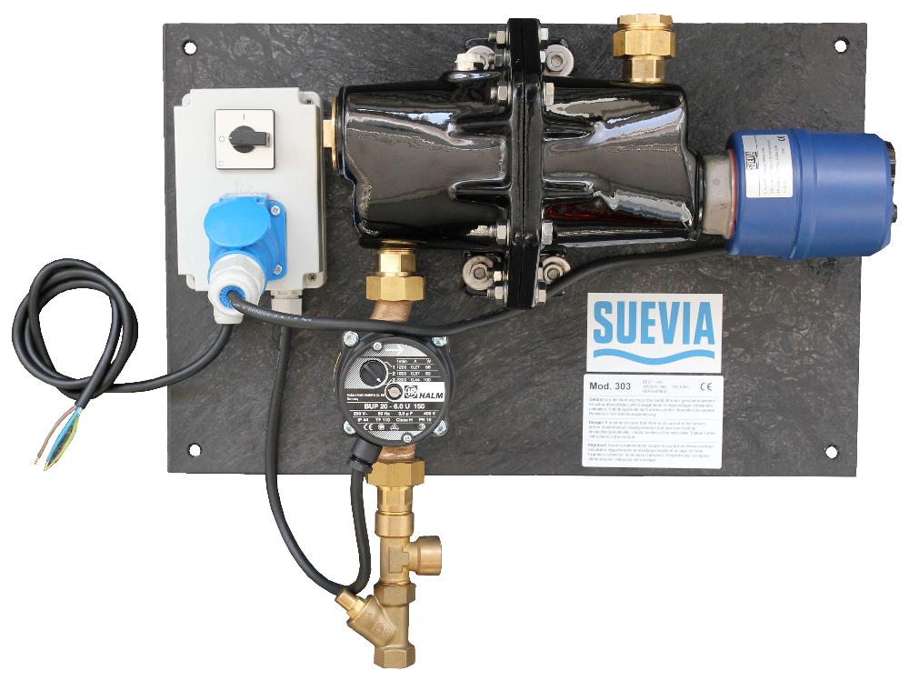 en cas de fortes gelées. La résistance est équipée d’un thermostat avec sécurité de surchauffe. La température souhaitée est réglée par une molette graduée se trouvant sur l’appareil. Corps de chauffe est en fonte émaillée. Résistance de 3000 W et pompe de circulation (230 V, 100 W), livrés prêt à installer sur une plaque pour fixation murale. Les raccords d’eau sont en ¾". Livré de série avec une purge automatique, une soupape de surpression, un clapet anti-retour et une soupape anti-retour. Un disjoncteur différentiel de 30 mA (non fourni) est nécessaire pour protéger l’installation électrique.
