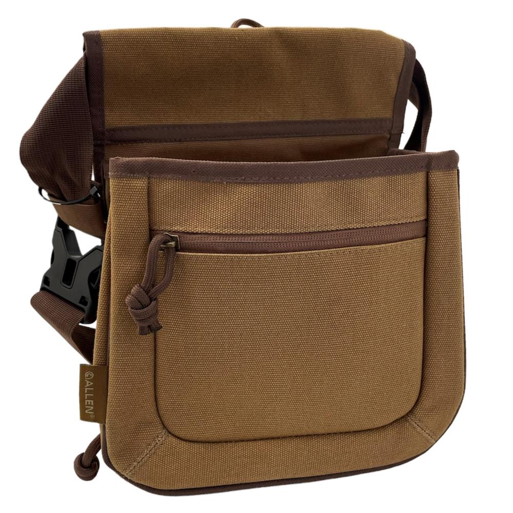 Le sac à cartouche de la marque de chasse Allen est un sac pour mettre des cartouches de chasse. Ce sac de coloris marron clair peut s'attacher à la ceinture ou se porter sur l'épaule à l'aide d'une bretelle.