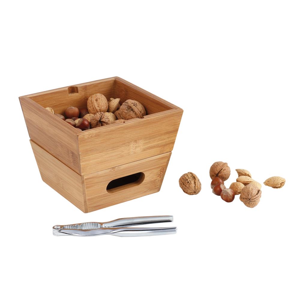 Set casse-noix avec 2 bols en bambou empilables avec emplacement pour casse-noix.
