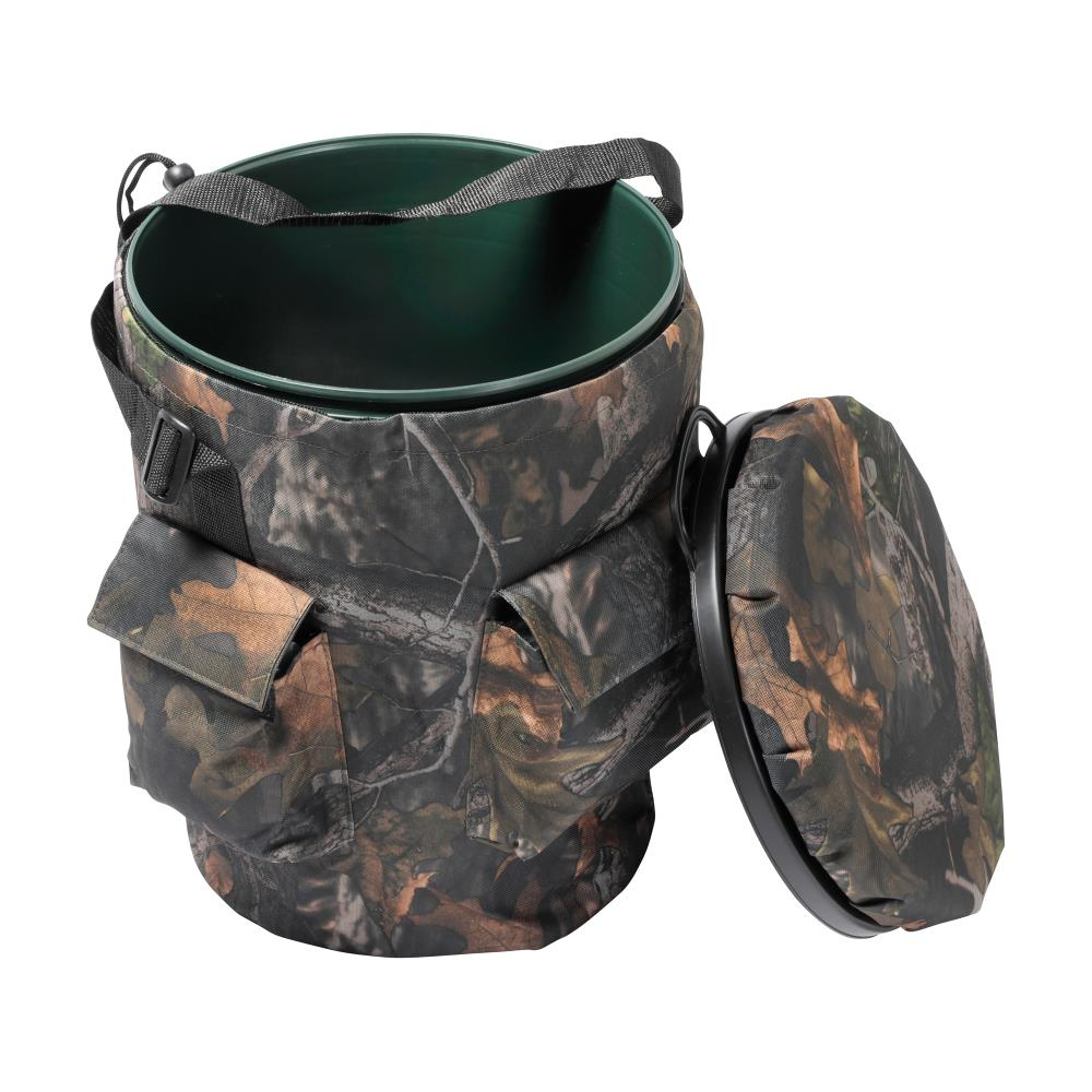 Capacité : 26L. Hauteur d'assise : 38 cm. Diamètre du seau : 29,5 cm. Couvercle rembourré pour une assise plus confortable. Coloris : camouflage forêt. Taille unique.
