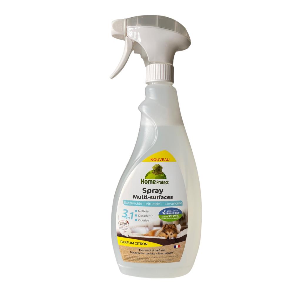 Le spray multi-surfaces de chez Home Protect a un effet bactéricide, virucide et levuricide. Il nettoie, désinfecte et odorise avec sa bonne odeur de citron les surfaces à nettoyer. Le spray libère un produit moussant qui assure un bon nettoyage. Les vétérinaires sont adèptes de ce produit ! Le spray multi-surface est très facile à utiliser grâce à son conditionnement et élimine 99,99% des bactéries et des levures. Sans rinçage, vos animaux de compagnie ne risquent rien avec ce désinfectant fabriqué en France.Lire la suite