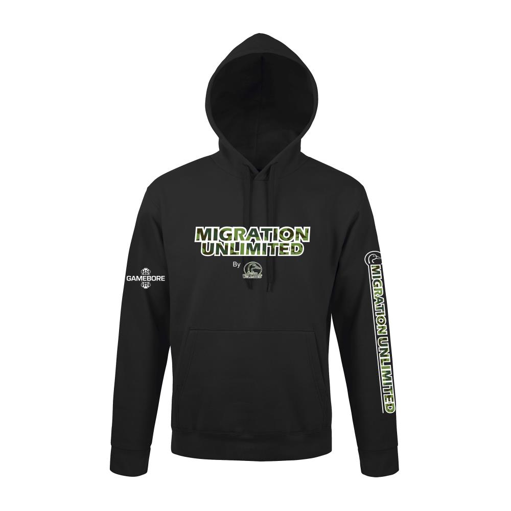 Composition : 80% coton, 20% polyester. Coloris : noir. Logo : Migration Unlimited et Gamebore. Tailles : du S au 3XL.