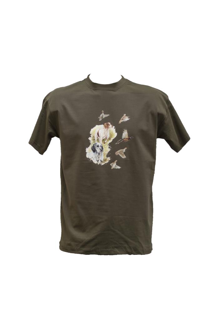 Composition : 100% coton peigné (190g/m²). Coloris : kaki. Motif imprimé : épagneuls et petits gibiers. Tailles : du M au 3XL.
