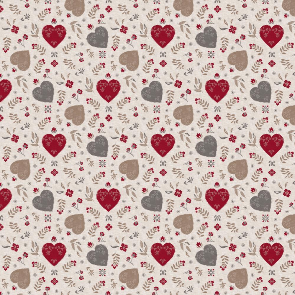 Vendue au mètre, la toile cirée Coeurs vous permet d’ajuster précisément la longueur selon vos besoins.