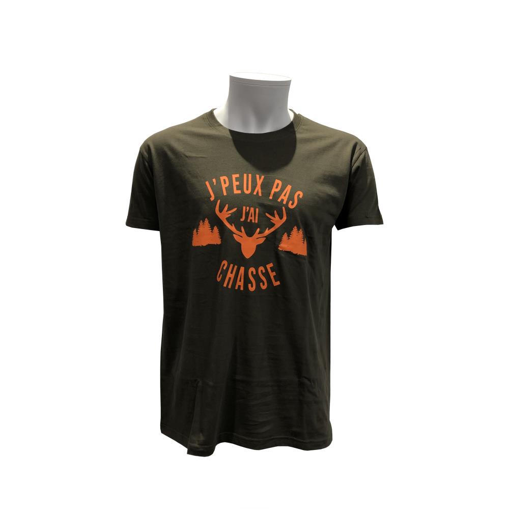 Composition : 100% coton. Flocage : J'peux pas j'ai chasse. Coloris : kaki et inscriptions oranges. Tailles : du M au 3XL.