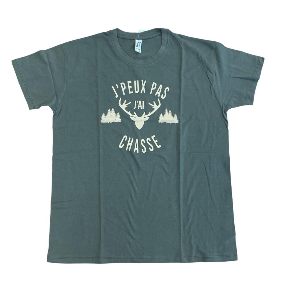 Composition : 100% coton. Flocage : J'peux pas j'ai chasse. Coloris : kaki et inscriptions beiges. Tailles : du M au 3XL.