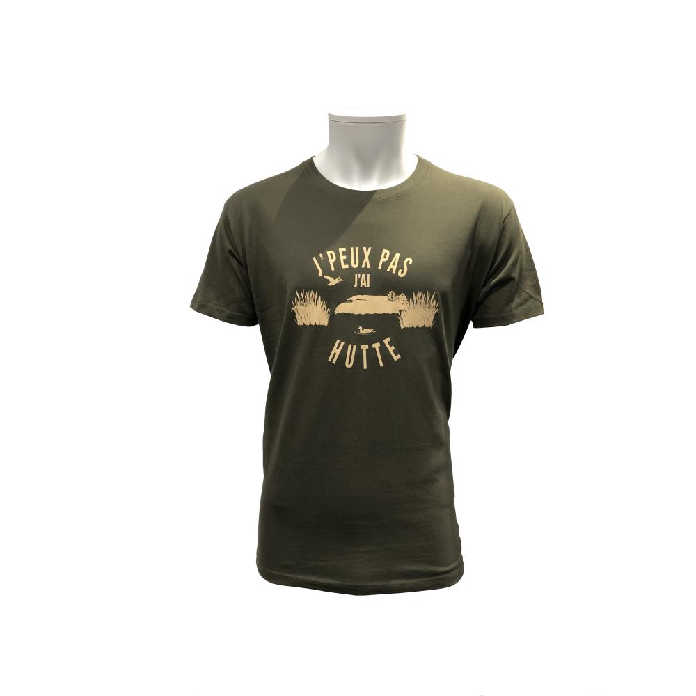 Composition : 100% coton. Flocage : J'peux pas j'ai hutte. Coloris : kaki et inscriptions beiges. Tailles : du M au 3XL.