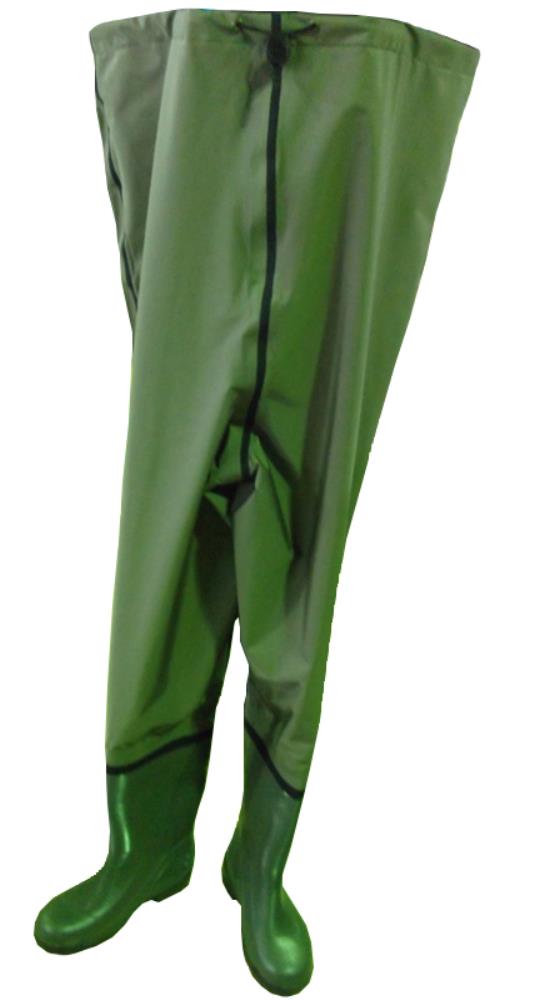 Waders avec bretelles élastiquées et réglables. Bottes avec semelle crantées.